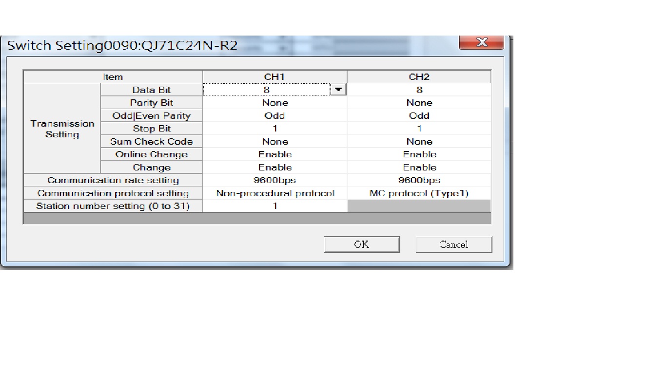而通訊模組(QJ71C24N-R2)也設定一樣(只用到CH1),站號為7 SW1(05C2) SW2(0006) SW5(0007)