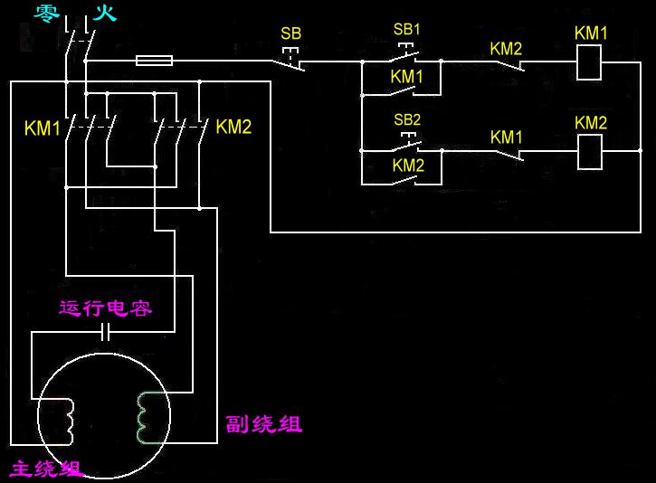原理是這樣的, 單相電機要改一下線圈接頭,副線圈及主線圈的兩邊接頭都引出來,通過兩個繼電器的轉變,正轉是副線圈頭與主線圈頭共接,反轉是副線圈尾與主線圈共接(電容式的,副線圈的另一頭是接電容的)這樣就可以正反轉了。 |