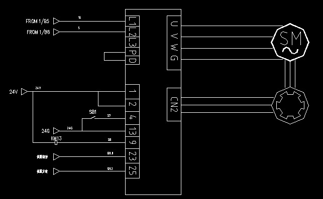 圖片是三菱J2-S系列伺服的接線。由于PLC是輸入是高電平的,故障輸入加了個繼電器轉換一下。SB1是個小開關,控制伺服使能的。