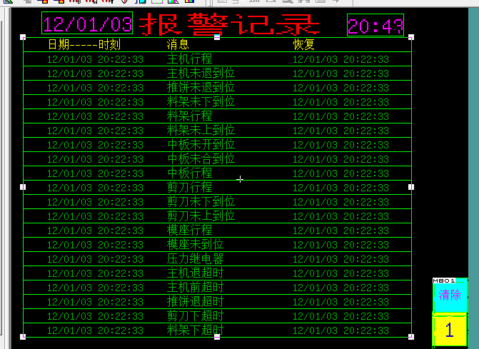 剛做了一個(gè)畫(huà)面,加了系統(tǒng)報(bào)警,能正確顯示報(bào)警記錄,但到了報(bào)警記錄顯示行數(shù)后,新的報(bào)警記錄就不會(huì)再顯示出來(lái),必須手動(dòng)清除后才能重新顯示,不知是什么地方設(shè)置不對(duì),請(qǐng)大家?guī)兔Ψ治鱿略?