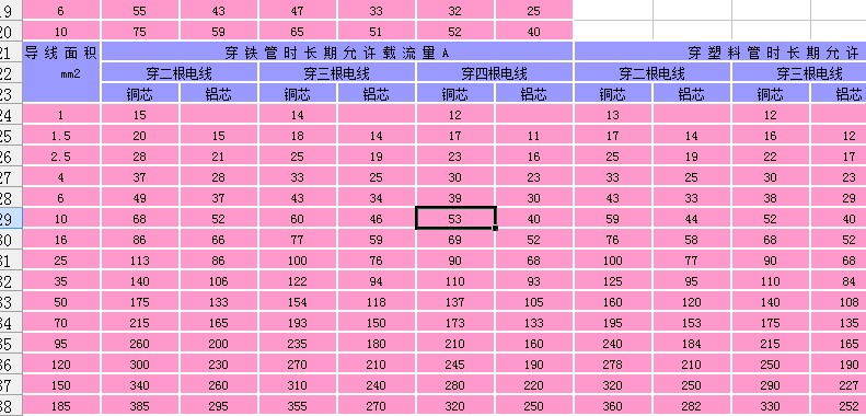 1樓的圖是說:10mm2(銅芯)在鐵管內穿4根時,安全電流為53A
