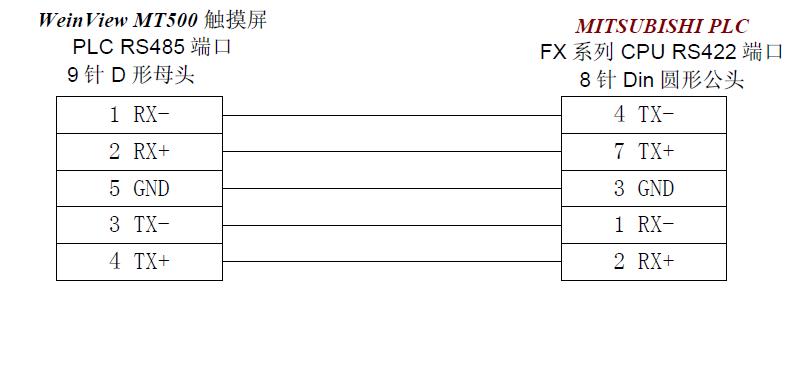 說明書上只有MT500與三菱FX系列PLC的連結方法,請教各位朋友:MT6050i與FX3G通信線的連結方法是圖上這樣嗎?供應商給我的通信線是5-5的,其它一樣。但是PLC與MT6050i通上電后,屏上總是顯示“PLC NO RESPONSE",如果線沒有問題,PLC和MT6050i兩邊要怎么正確設置?謝謝大家?