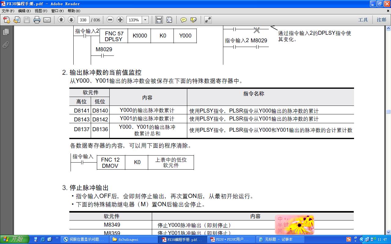 看你用什么指令,比如說是用DRVI,DRVA指令做寸動的話,則脈沖過程值保存在D8340,D8341(雙字,對應Y0),D8350,D8351(對應Y1),D8360,D8361(對應Y2),如果是還有擴展的話,還有D8370,D8371(對應Y3),而如果是使用PLSY和PLSR的話,則過程值保存在D8140,D8141(對應Y0)和D8142,D8143(對應Y1),這些值對應的都是脈沖數,要轉換顯示mm還要幾個數據,比如說電機轉一周模塊發(fā)出10000個脈沖,螺桿的螺距是10mm,轉速比為1:1,電機反饋的脈沖數是131072,那么脈沖當量是1微米,即用1000個脈沖表示1mm,所以程序可以這么做:LD M8000 DMOV D8340 D30 ,DFLT D30 D32,DEDIV K10 K10000 D34,DEMUL D32 D34 D36 ,DINT D36 D38,那么這時候的D38,D39就是你屏幕里出現的顯示值,出現負數,那并不要使用SUB指令,程序在原點之后過程值清零,而在往負限方向走時,過程值自然變?yōu)樨撝担陨险垍⒖迹?br />