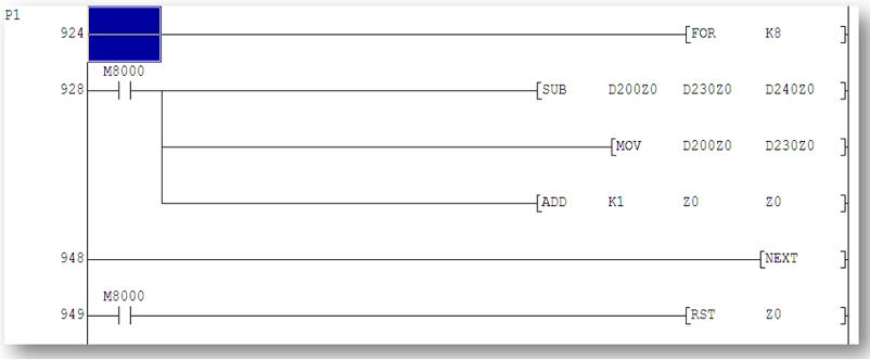 變址的目的能減少判斷程式的容量,如mov K20 D100Z1,假如Z1的值為23,那麼指令的意思相當於MOV K20 D123,如果能理解FOR,     NEXT循環指令的用途,可用很少的程式記錄很多的數據,很好用的,絕對能實現你之前提出的動作要求。