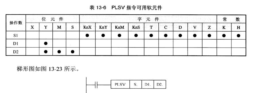 由于選用FX2N+定位模塊價格高些,最近買了個FX3U的PLC,想直接用一個PLC來實現我上述的功能,降低價格。遇到了一個困惑,在FX3U的定位控制篇手冊的時候,有一個可變速脈沖輸出指令PLSV,用于在脈沖輸出的同時改變脈沖頻率,從而改變伺服電機轉速,實現多段速控制,但沒有像定位模塊中一樣的可以預先設置輸出脈沖數量的軟元件,不能用于精確定位。如下圖: