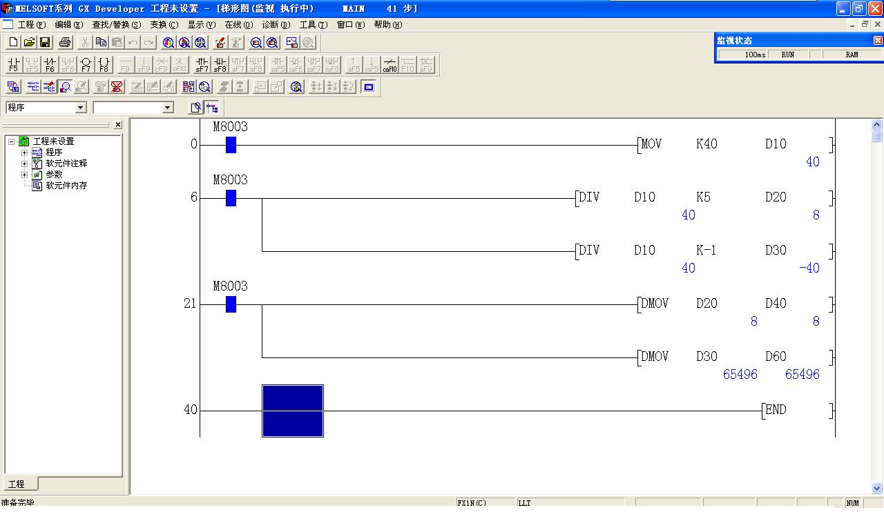 根據(jù)FX1N手冊(cè) [DIV D2 D1 D10]等于D2/D1,得出的數(shù)據(jù)存入[D10 D11]中,存入結(jié)果為32位。