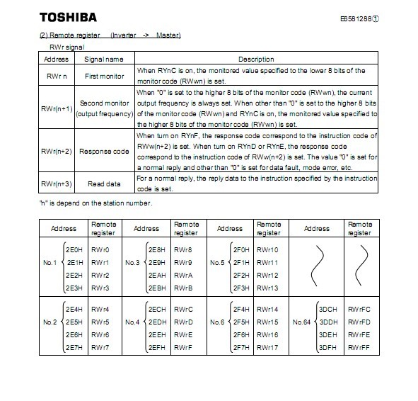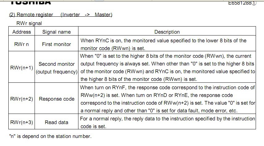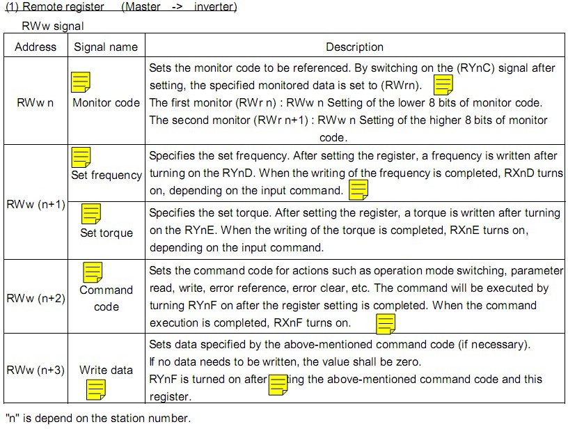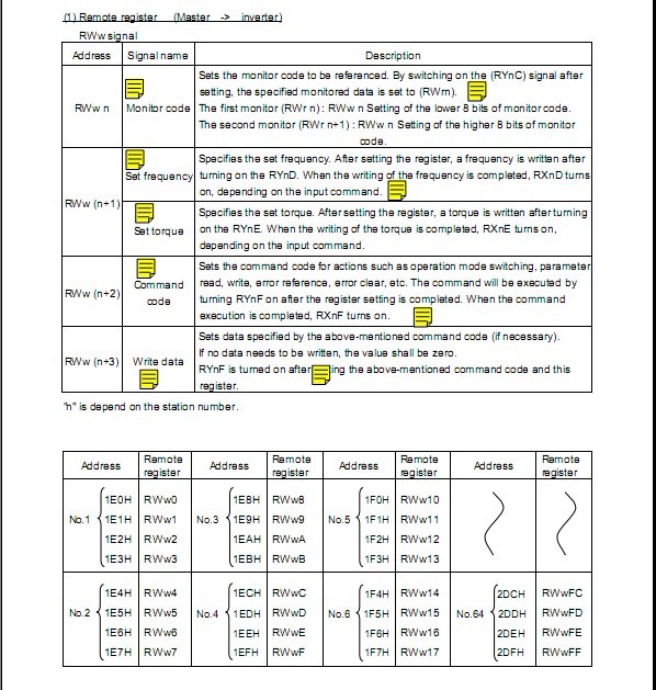 RWwn 監視代碼,設置涉及(參考?)到的監視代碼(對變頻器而言可以使頻率,電流,電壓以及各個參數)。接通RYnC后,指定的監視數據傳輸(設置)到RWrn。