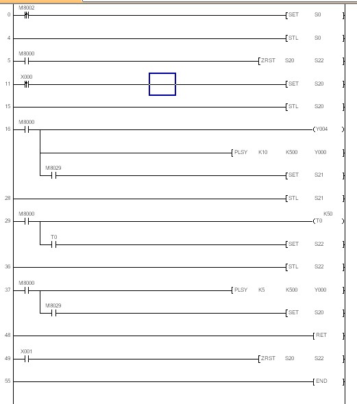 新問題又出現了,如果在程序中又加一條PLSY指令,用來控制Y1,編程方式跟控制Y0一樣,程序也會停留在第一個脈沖那一步,M8029不置ON,而用定時器觸發下一步,順序可以通暢跑起來,這證明如編程手冊中說的一樣,可以多次使用脈沖輸出指令,但這問題是不是意味著程序中有兩條以上脈沖輸出指令時,M8029使用就有問題?各位不防試一下。