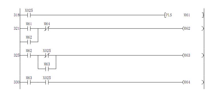 如果刪除了325那段程序時,M62只能是點動了。X25通,那么M62也通,那M64也會通,這時OUT M64就會斷開,按一下X25時,M62脈沖式的通一下就斷了,所以M62永遠無法自鎖保持。 而325那段程序的作用就是把X25通時輸出一種狀態并保持,X25不通輸出一種狀態關保持。簡單的說325那段程序就是起了一個X25的ON/OFF的切換并穩定的保持它的兩種狀態。 |