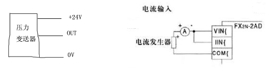 請教:壓力變送器為4-20mA信號,1根電源 、1根信號 、1根地線。如何與三菱的FX2N-2AD模塊接線?