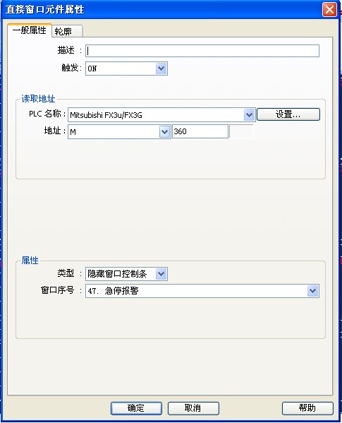 直接窗口元件:讀對PLC地址:比如M0。0,報警時置位M0。0。屬性類型:隱藏窗口控制條,