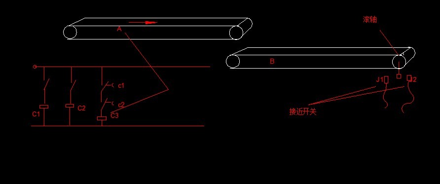 被卡或斷離,我用了兩個延時斷開的時間續電器和兩個接近開關,當B滾軸停止轉動時A設備跟著停止,解決這一問題,圖只是