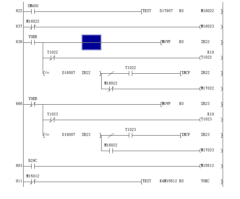 PLC是跟IFIX通訊的  M15000到15127一直是得電,我認為現在就是M15012不通導致test指令不能執行,雖然M15512的值在變但是 后面的Y0EC一直是ON
