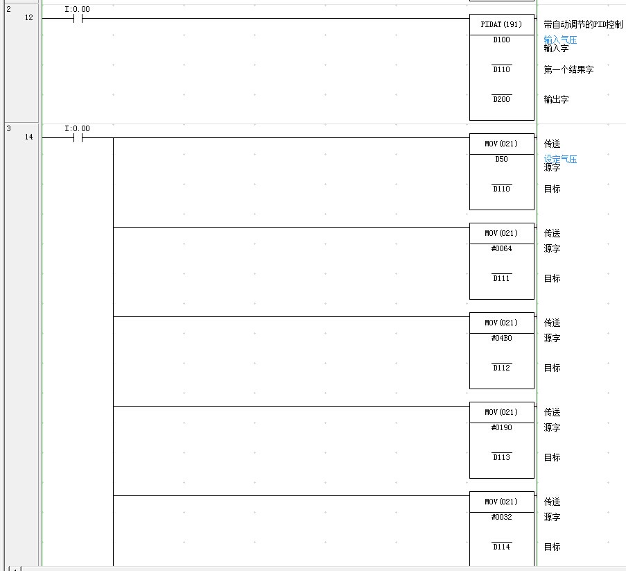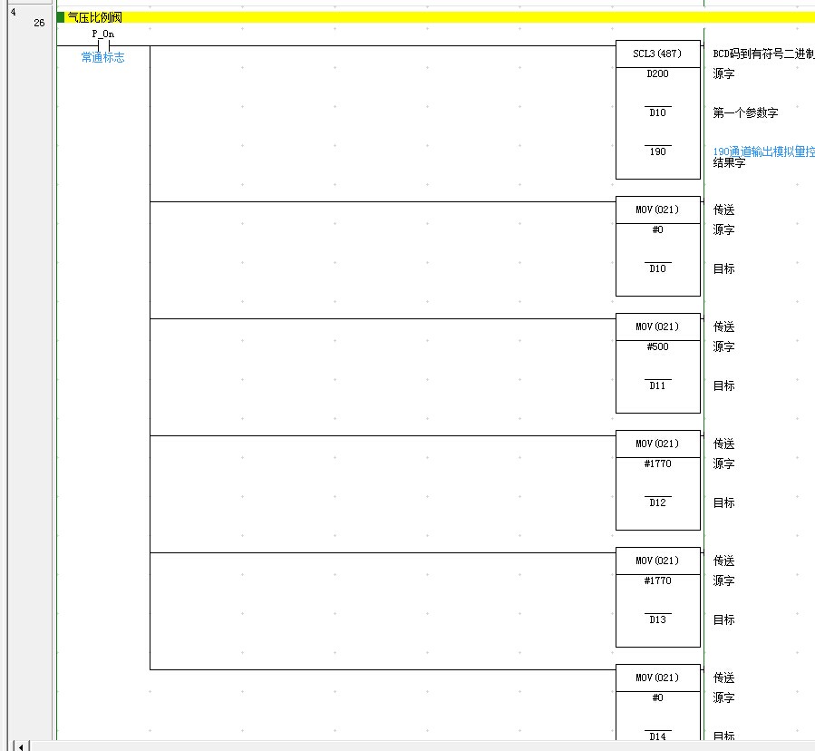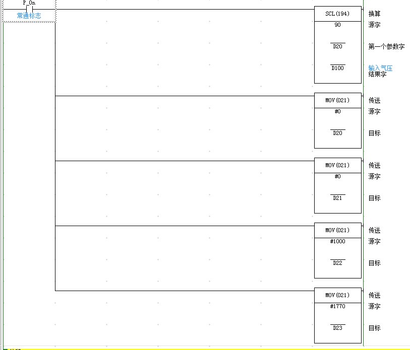 程序的目的是,設(shè)定一個(gè)氣壓D110,然后用PIDAT指令輸出控制SCL3指令,SCL3控制電氣比例閥(0-5V),電氣比例閥控制氣壓達(dá)到D110的值.D110的值是隨時(shí)可變的  /D100的值是另外一個(gè)氣壓表輸出的實(shí)際值(1-5V).