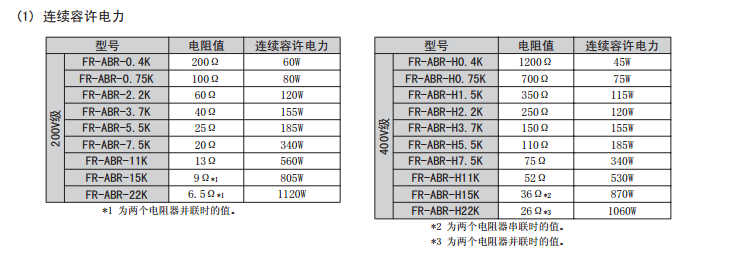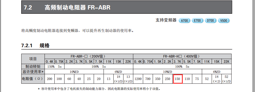 500W200Ω剎車電阻能用于FR-E740-3.7KW變頻器上嗎?說明書沒具體提及剎車電阻的阻值及功率,手頭有個剎車電阻,不知道能不能用。