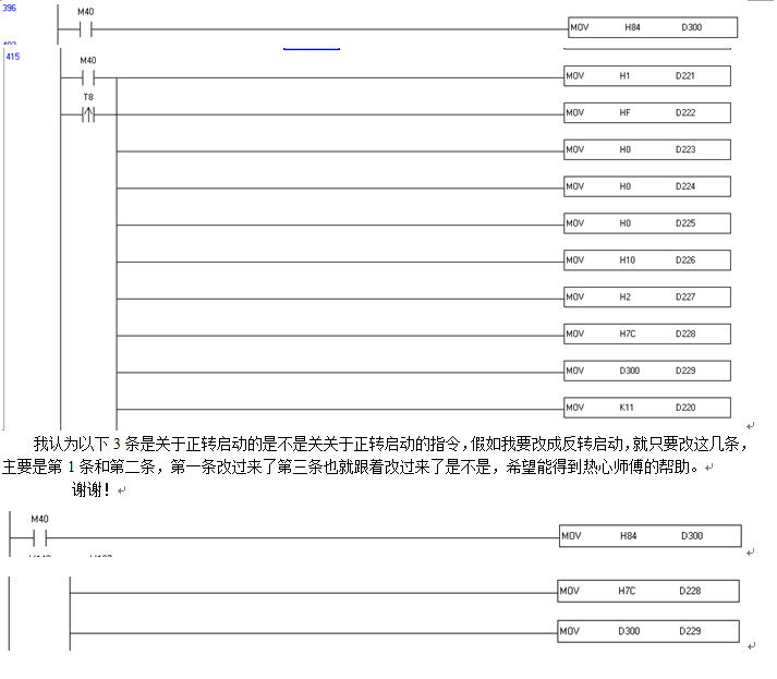 謝謝您的回復(fù)!主要是不知道控制正反轉(zhuǎn)的是哪一步的哪條指令,所以不知改改哪一行的哪條指令,然后轉(zhuǎn)成變頻器能夠識(shí)別的指令啊。 |