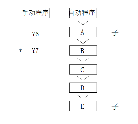 如圖,有手動、自動程序(手動程序中已用Y6Y7),而自動要走5個子程序,每個子程序都要用到Y6,如子程序A結束后要回到手動程序Y7段,然后才執行下一個子程序B,不知用CJ、CALL.......如何處理,懇請大神賜高見。