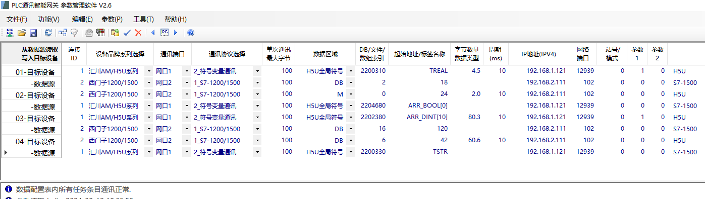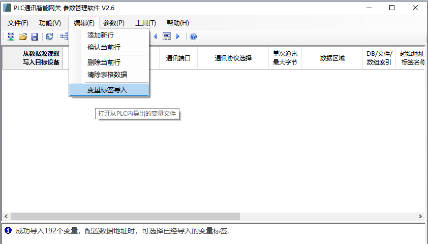 本案例采用西門子1200的PLC跟匯川H5U的全局變量標簽方式通訊,通過智能網關的參數軟件(在附件中)選擇PLC之間通訊的功能,通過(編輯->變量標簽導入)加載從H5U的PLC內導出的HMI監控變量表,如下圖,導入成功后在狀態消息欄有提示: