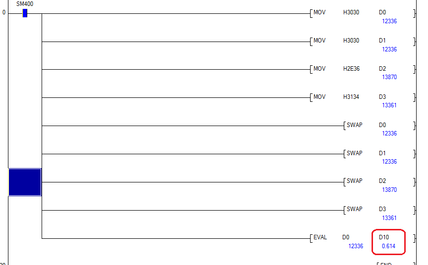 D80 轉(zhuǎn)BIN => D96 轉(zhuǎn)實數(shù) => D106 *0.01 ==>D116