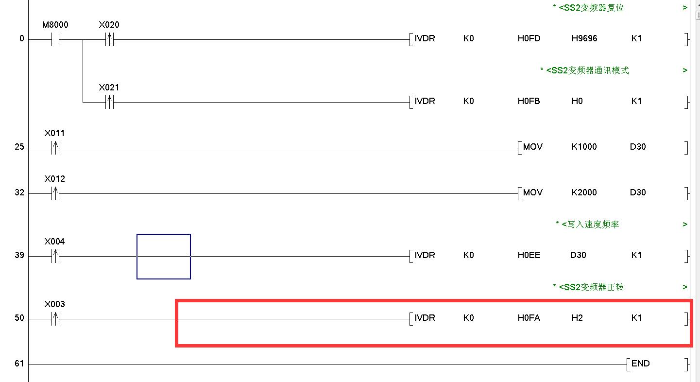 FX3U的PLC帶FX3U-485-BD與士林SS2-021-0.4K做485通信。    X4接通變頻器可以正常收到頻率。    X3接通變頻器不啟動。是不是什么原因啊。如測試程序。