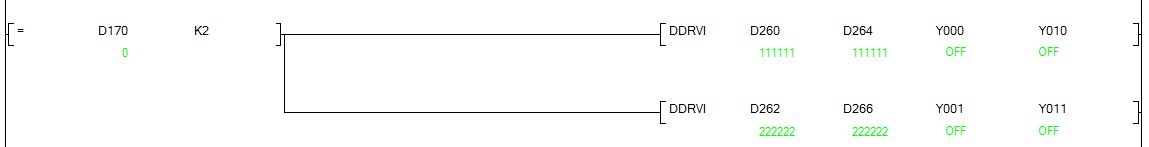 一臺(tái)FX3U可以控制兩臺(tái)伺服同時(shí)啟動(dòng)同時(shí)停止嗎?要求Y1發(fā)的脈沖總數(shù)和脈沖頻率分別是Y0發(fā)出的脈沖總數(shù)和脈沖頻率相同倍數(shù),程序如圖