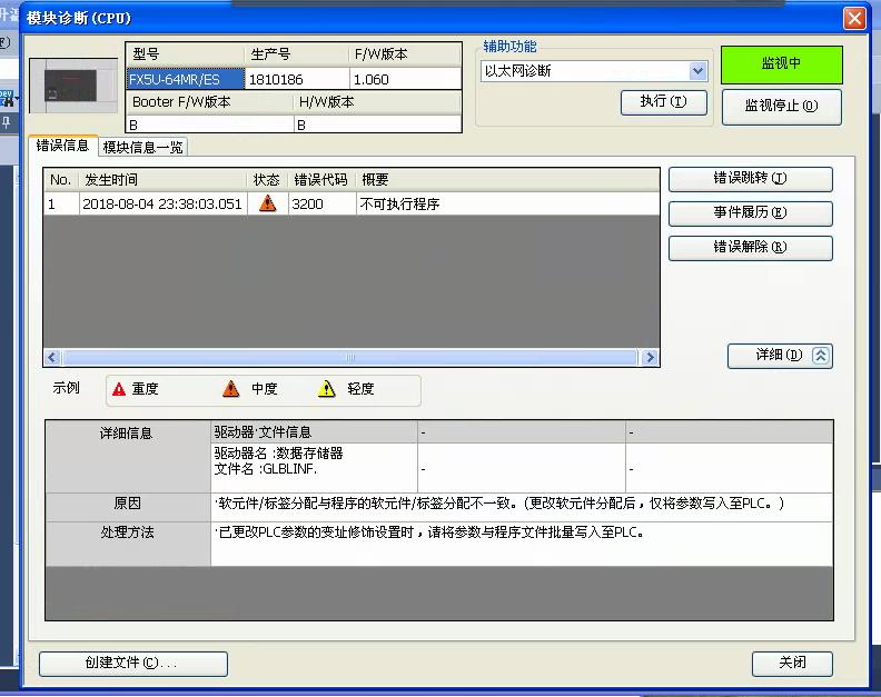 由于一個程序都是類似的,使用了好多標簽,再增加的其它標簽的時間,內存不夠.我找了好久才調節好標簽內存.程序可以正常編譯.然后給遠在廣東的技術人員下載,這時間就報3200,打電話問三菱技術人員,他們也是按書面意思說了一下,沒有實際的幫助.故障一樣存在,后來我找一臺新的PLC下載后并不報這個故障.果斷告訴技術人員,將內存清空再次下載.PLC運行正常.與同行共勉!!!