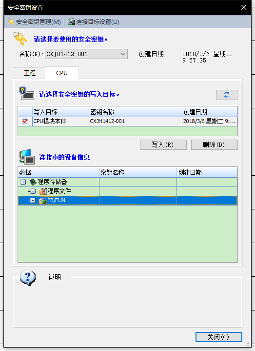 5、多次嘗試后,發現:寫入不帶密匙的程序后,可以通過GXW3刪除CPU的密匙,如圖所示界面;