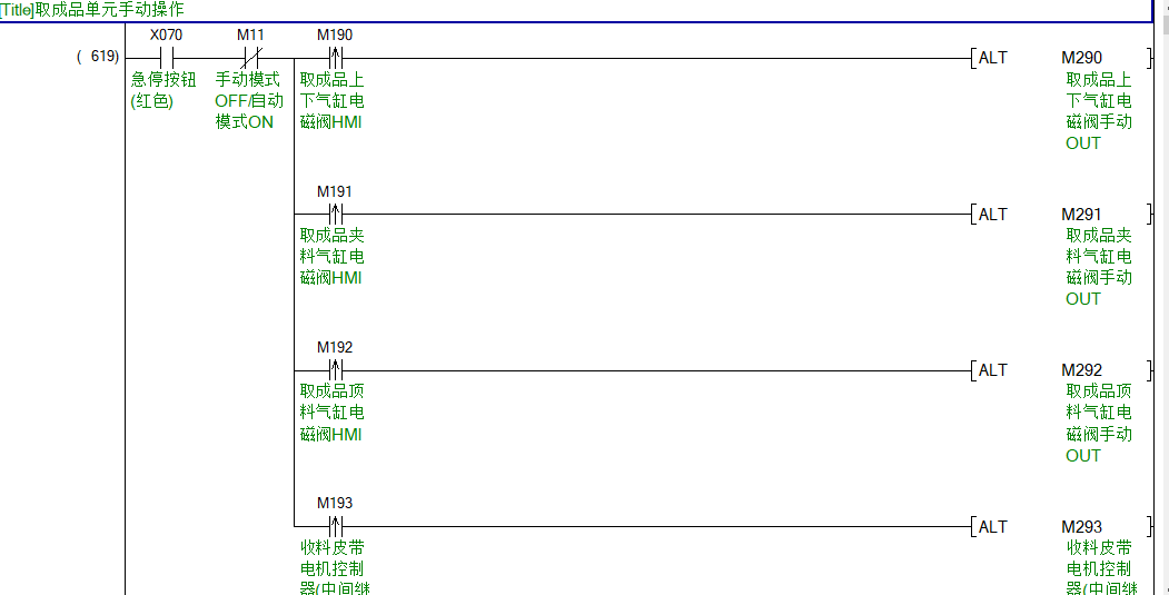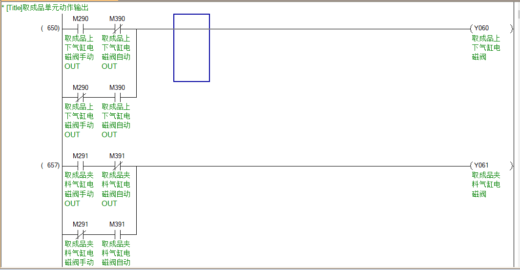 就拿M290和M390來說吧,假設自動運行時M390--ON的時候,Y60--ON,這個時候進行手動模式,不會影響M390---ON,進行手動操作讓M290變成ON的,這樣M290常閉點就會斷開M390常開的那條路,也就是控制Y60斷開。如果M290交替再斷開,下面那條路又導通,這樣就可以實現Y60狀態進行轉換,當手動操作完后,進行自動模式后,按啟動按鈕就會把手動操作全部復位掉,又自動變到之前的自動狀態。