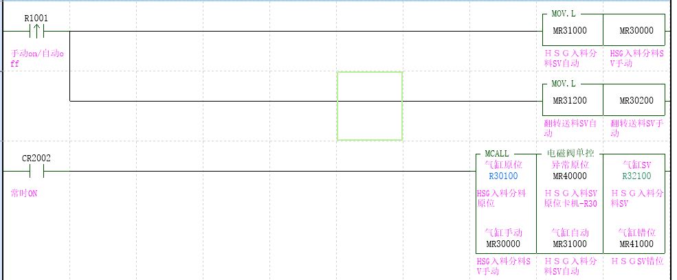 你這個在氣缸運行時,有點危險的,我是這樣做的,可以討論一下,首先手動的動作和自動的動作要對應,比如氣缸1手動是M1000,那么氣缸1自動就是M2000,氣缸2手動是M1001,那么氣缸2自動就是M2001,當自動切手動時,把自動狀態整體傳送給手動狀態,這是還要加一個對比判斷,就是切到手動,動了其他氣缸后,氣缸的當前狀態和自動輔助繼電器的狀態要一致,如果不一致,就要標識出來,需要把氣缸還原回去的