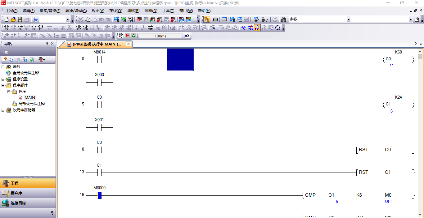 這是一個溫度控制的程序,D1存儲的是當前溫度值,D200是溫度設定值。C是計時器(記錄M8014脈沖數的),這幾個程序步是通過比較D1和D200的數值,當D1≥D200的時候,M40和M41就復位M40,當D1小于D200時,M42動作設備開始加熱。這個M40是長期處于比較狀態的,所以必須要用RST指令復位。