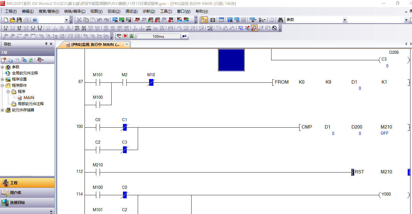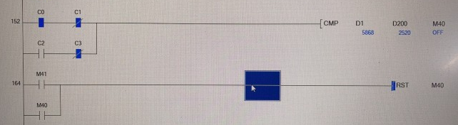 D1>D200,M40當然動作,你又利用左下方的M40觸點接通RST M40進行復位,能復位嗎???你能復位輸出動作點,但你不能復位動作條件D1>D200,你這程序行不通的