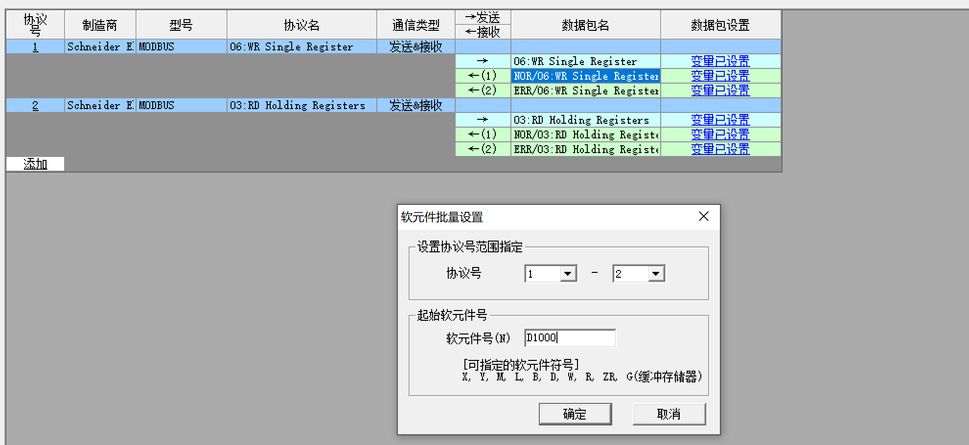 沒錯modbus,就選三菱已經集成的在制造商列表選擇施耐德 modbus,接著選擇你需要的功能碼 常用的03 06 功能碼等等多的很,注意可以添加多個協議號 到時候有相應的指令可以一起執行 添加后可以右擊批量修改寄存器配置。方便的很。