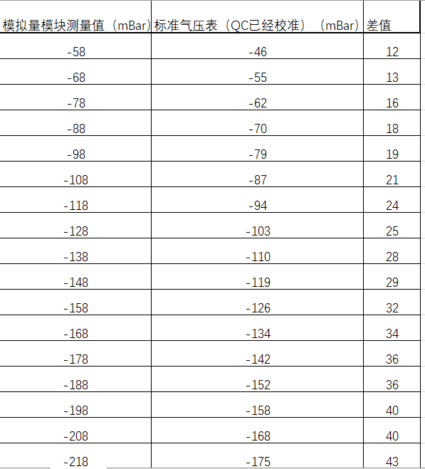 實際程序運行發現: 模擬量模塊讀取實時負壓,與標準壓力表的讀數總是不一致。除了標準大氣壓下都是0mBar外,在負壓條件下,它們讀數總是有差值,而且差值非線性(參見附件表格截圖)。
