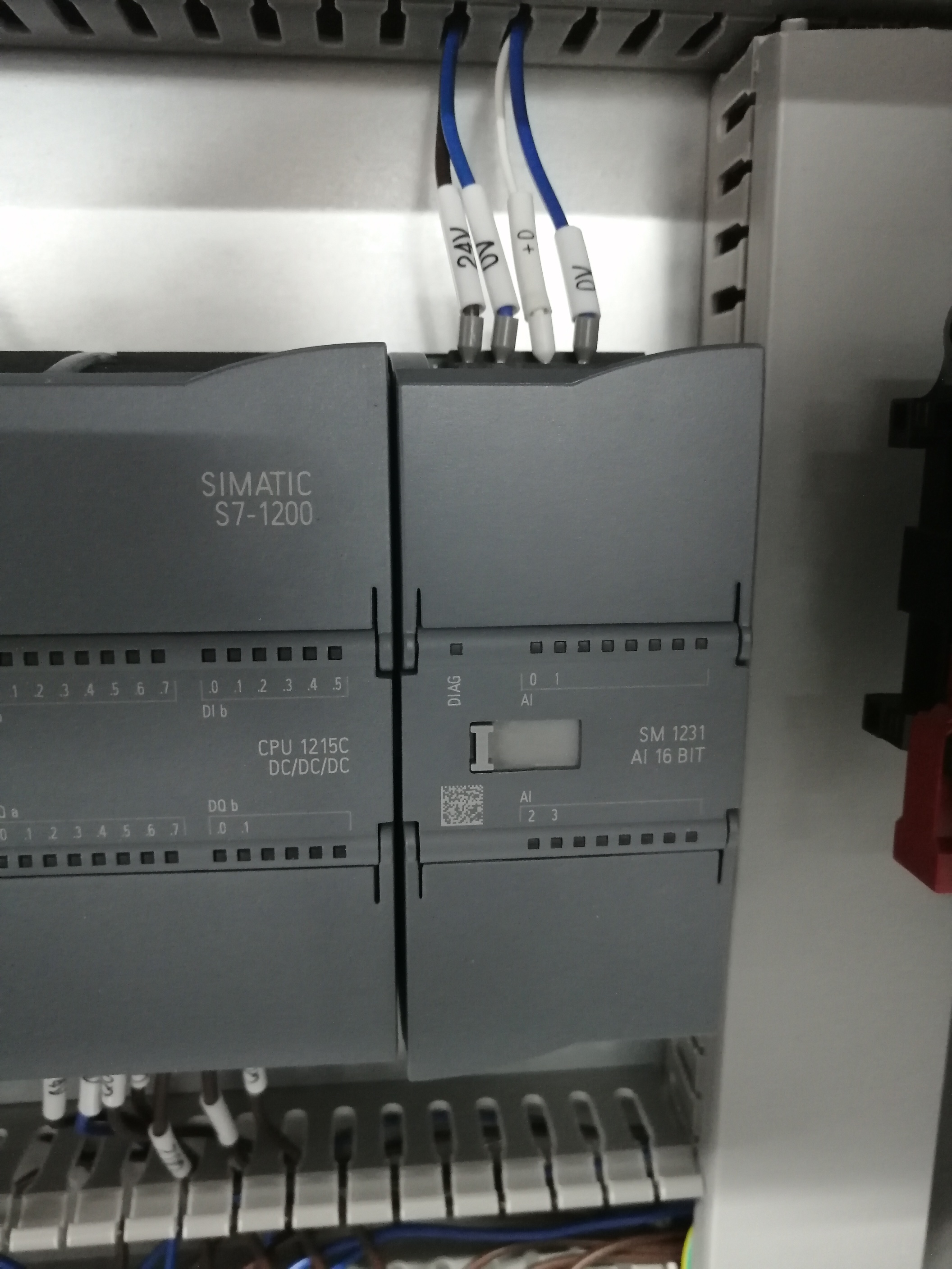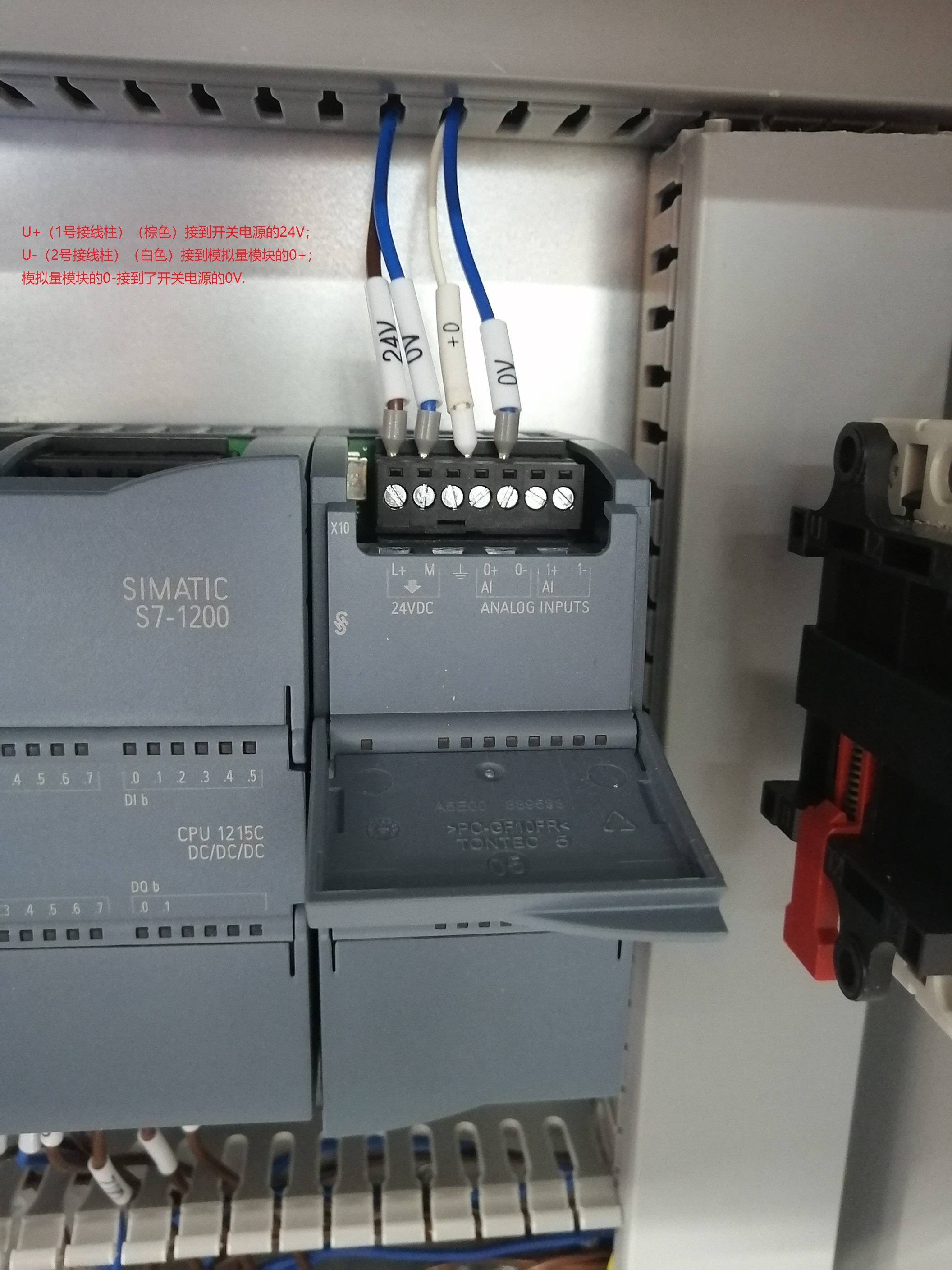 傳感器是2根線,棕色接開關電源24V,白色接模擬量模塊的0+。模擬量模塊的0-接了開關電源的0V。
