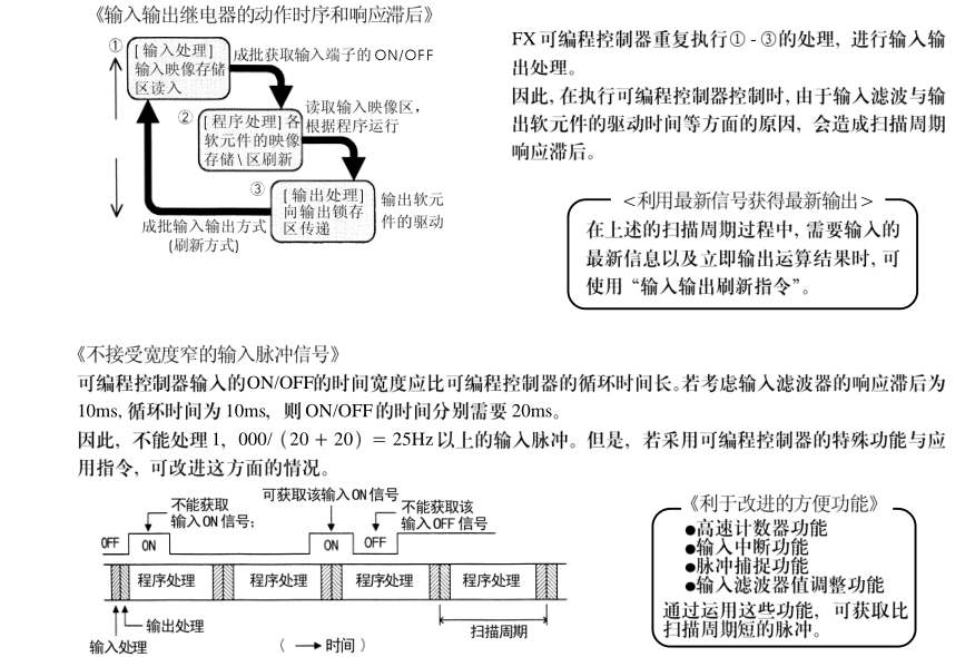 記得編程手冊對程序執行方式和輸入輸出滯后是有說明的,特地翻了下,三菱1N2N的編程手冊有,FX3的就沒看到
