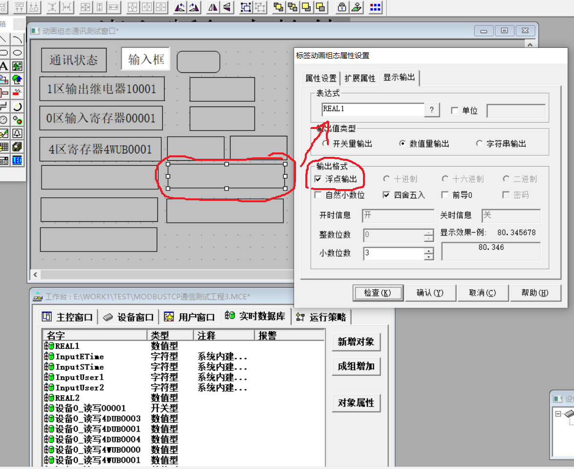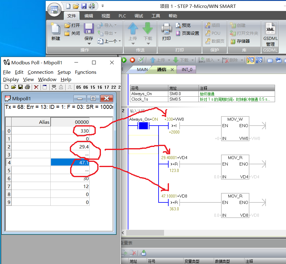 各位大神,我用MCGS屏與smart200 PLC做個(gè)Modbus TCP通信測(cè)試,在Modbus Poll軟件端可以查看到和plc里的VD地址數(shù)值一致,但在屏端顯示就很不正常,不知這什么問題,請(qǐng)有知道的大神指點(diǎn)指點(diǎn),,感謝!! ![]() ![]() ![]() ![]() ![]() |