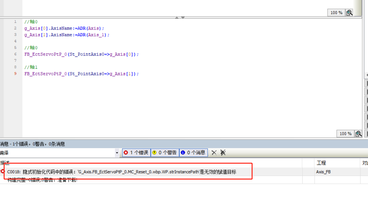 Axis_FB: C0018:  隱式初始化代碼中的錯誤:'G_Axis.FB_EctServoPtP_0.MC_Reset_0.wbp.WP.strInstancePath'是無效的賦值目標