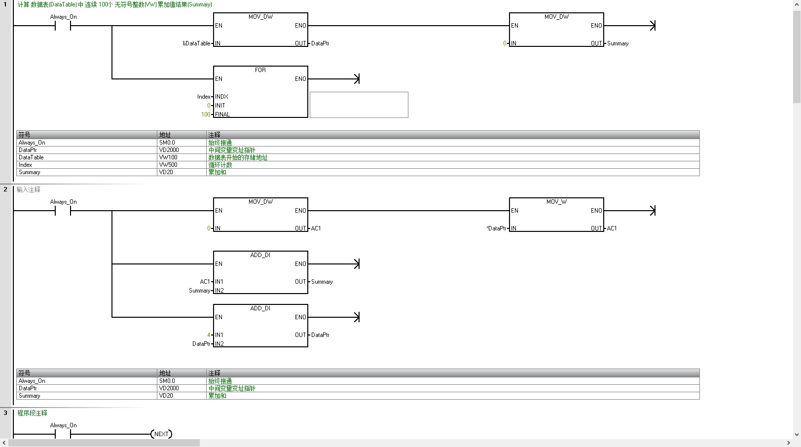 200smart怎么求幾個連續地址中的和值,如VW100-VW200,100個數的和值呢,用變址加循環,總是報錯。