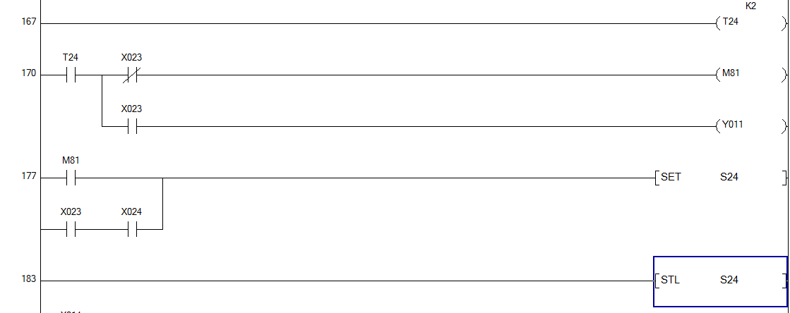 T24是定時器,后面跟K十進制數(shù)值配合使用,程序是T24 K2就是定時2*0.1=0.2秒;STL24是步進圖序號 |