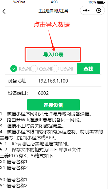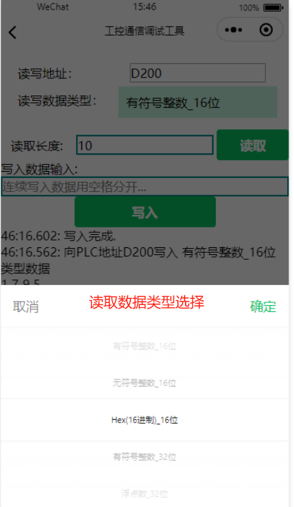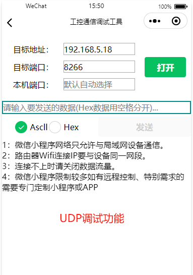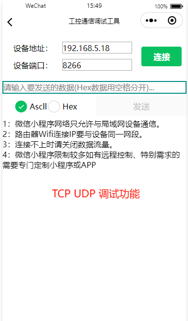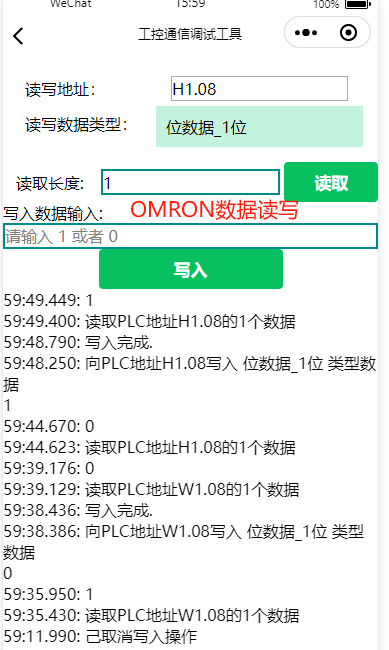 手機時代到了,一直用電腦調試有時候不方便,簡單的東西確認可以用手機測試不必打開電腦。本小程序支持1.三菱PLC IO查看  數據讀寫。2.歐姆龍PLC IO查看  數據讀寫。3.Modbus TCP調試 數據讀寫。4. TCP UDP調試。