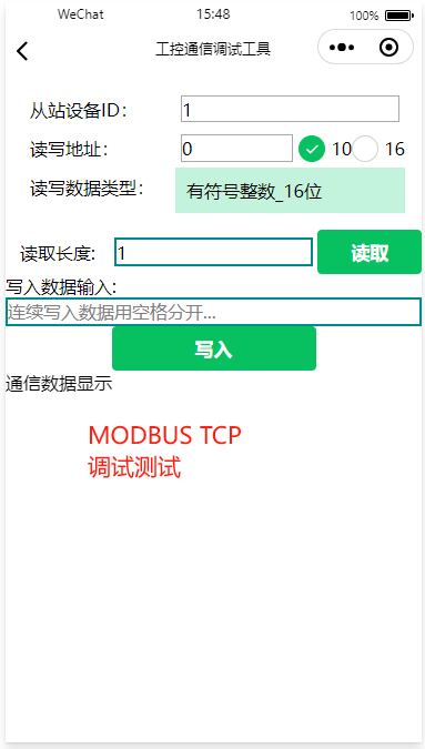 現在看到了,可以直接微信中開發個小程序,不管什么平臺都能使用,也不用擔心下載APP之類占用存貯空間了。在此分享給大家。希望能給大家帶來方便,如還有Bug可以告訴我更新一下。可以在微信小程序中搜索工控PLC MODBUS TCP調試工具