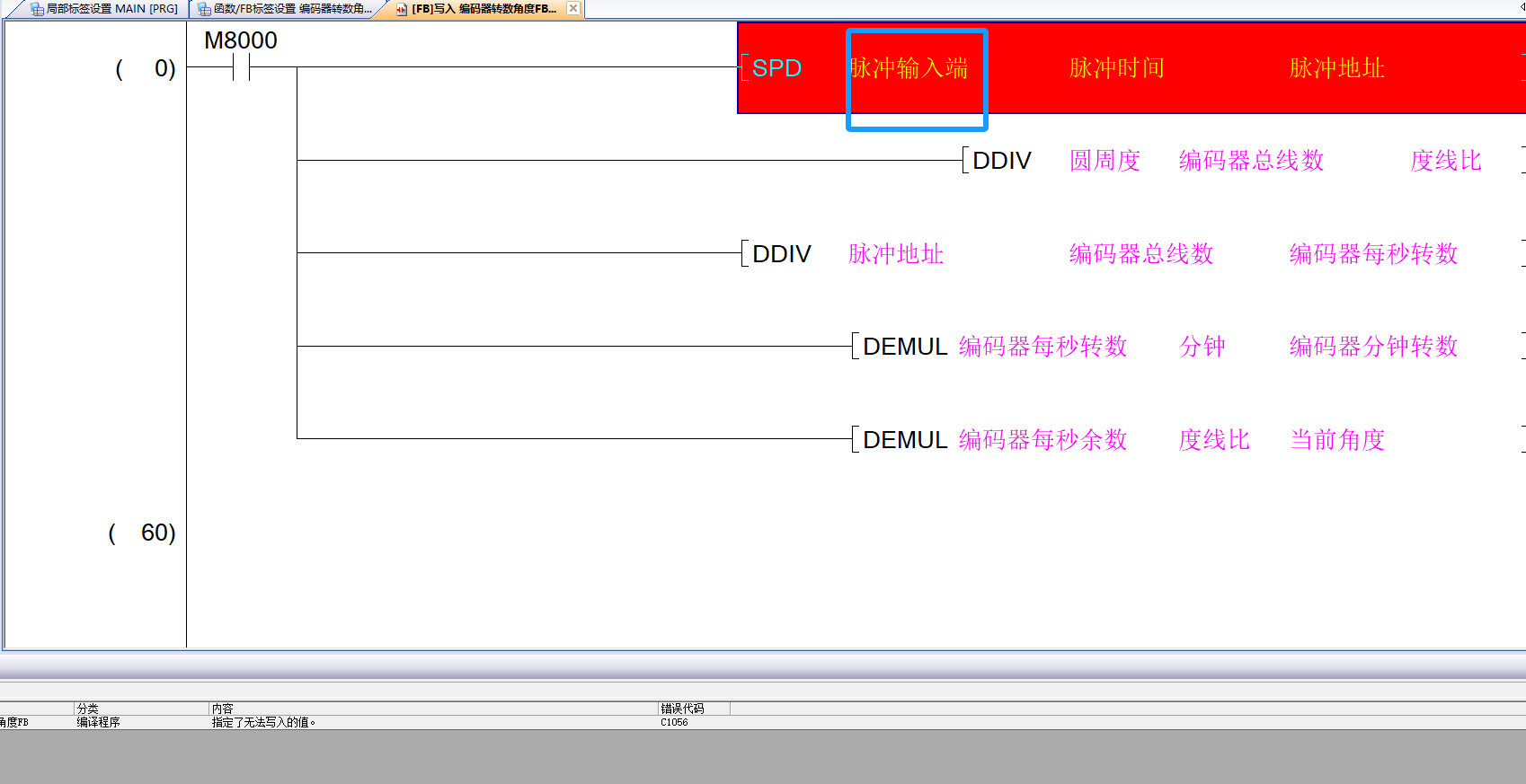 各位老師,我想制作一個編碼器轉數角度的FB庫,最后編譯提示SPD指定了無法寫入的值,估計是輸入端子X1或X0作為固定量非變量無法編譯。有么有什么辦法可以替換呢?謝謝!