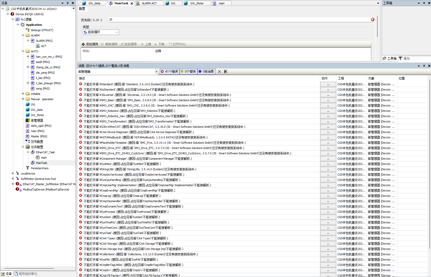 這一般 你使用軟件的 softmotion版本和編碼器版本比原程序高 導致一堆報錯 在工程設置里 選擇一樣的編碼器版本 和 softmotion版本 后 只會剩下一些 缺失庫的版本 缺失的庫 如何是官方的庫 可以直接庫管理里 下載缺失的庫即可 或者讓給你程序的人 不要把程序直接發給你 讓他打包程序(庫,softmotion,工程設置) 你打開打包的程序 解壓下就正常了 |