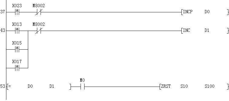 先說下我自己的看法,前面是兩個加1指令,第一個脈沖觸發,第二是連續觸發,最后一段開始是觸點比較指令,比較D0 D1中數據是否相等,相等則進行批量清零,其他的搞不清楚了