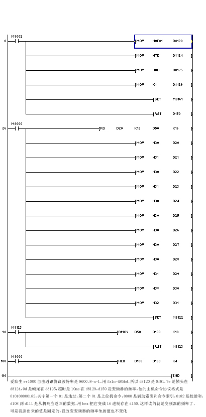 各位老大。fx1n和愛默生ev1000(原來華為td1000)的485通訊問題,是自由協(xié)議的不是modbus協(xié)議的。我比著葫蘆畫瓢寫了個程序想查看變頻器運(yùn)行頻率,結(jié)果不能正常通訊,不知啥原因,請各位看看,波特率是是9600,8-n-1。用fx1n-485bd,所以d8120是0f81.7e是幀頭在d8124,0d是幀尾在d8125,超時是10ms在d8129,d150是變頻器的頻率,他的主機(jī)命令協(xié)議格式是010100000182,其中第一個01是地址,第二個01是上位機(jī)命令,0000是輔助索引和命令索引,0182是校驗和,d108到d111是從機(jī)響應(yīng)返回的數(shù)據(jù),用hex把它變成16進(jìn)制存在d150,這樣讀的就是變頻器的頻率了,可是我讀出來的值是固定的是386,不知何故。我手動改變變頻器的頻率d150的值也不變化 ,他d109到d112是從機(jī)響應(yīng)數(shù)據(jù),是不是還要求和校驗啊,附件是愛默生變頻器通訊協(xié)議說明