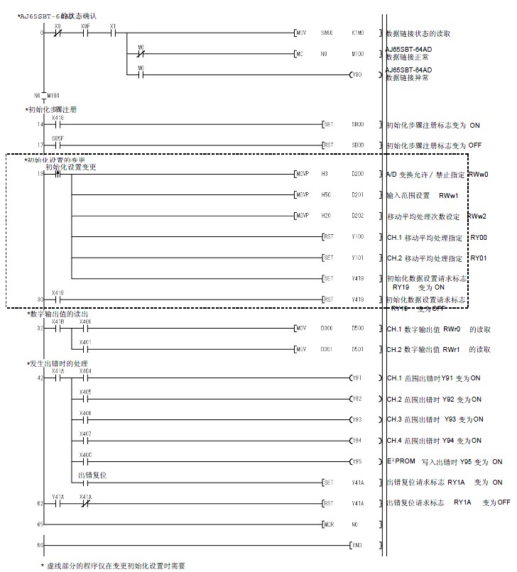 請教各位大大!~ 主站采用CPU(型號:Q04UDEHCPU) CC-LINK模塊(型號:QJ65BT11) 一個遠程I/0(型號:AJ65SBTB1-32DT) 二個AD模塊(型號:AJ65SBT-64AD)。 網絡參數設置: 起始I/0號:0000 總連接個數:3 遠程輸入(RX):X100 遠程輸出(RY):Y100 遠程寄存器(RWr):D500 遠程寄存器(RWr):D500 特殊繼電器(SB):SB0 特殊寄存器(SW):SW0 其他參數默認。通信站號 QJ65BT11為0 AJ65SBTB1-32DT 為1 AJ65SBT-64AD分別為2 、3 在AJ65SBT-64A/D 中文手冊上案例程序 如圖1 問題1 在初始步驟注冊的位置那里 如圖2 假設2號站位的A/D模塊占用了 SB0D 3號站位 的A/D模塊是否也占用 SB0D? 問題2 SB5F 代表什么意識,可以在那里找到注解。謝謝 圖1 圖2![]() [ 此帖被sjm213在2010-05-16 21:40重新編輯 ] |