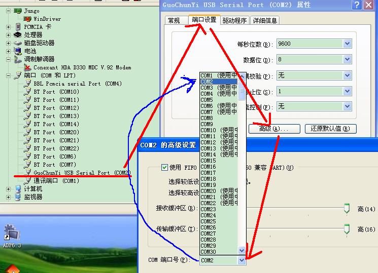 在“我的電腦”屬性----設備管理器中修改com口的屬性