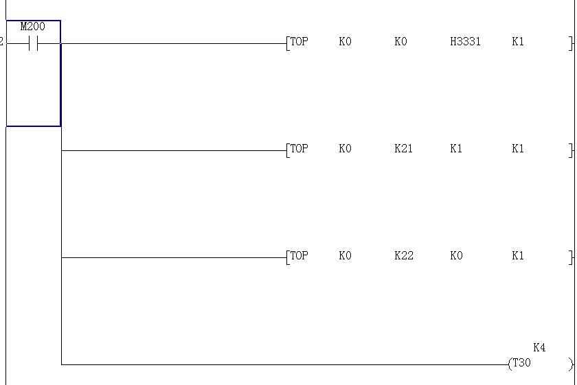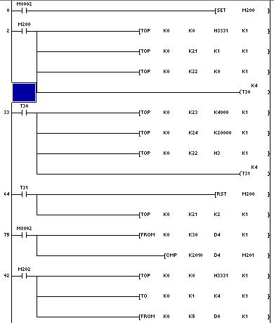 這是-4AD模擬量輸入模塊的初始化,M200被置位后0#-4AD的一通道設為+4ma----20ma的輸入,關閉二三四通道,(0#模塊的BFM#21是1,BFM#22是0,這個要看說明書),烤400ms,T30合上再烤入BFM#23.24.22,兩個十進制數4000.20000和十六進制數3,400ms后,T31合上,使M200復位,下一步查錯-4AD模塊的識別碼K2010,是對的,M202 合上,再寫入采樣次數為4次,讀0#模塊一通道的平均值存到D0存儲器中,