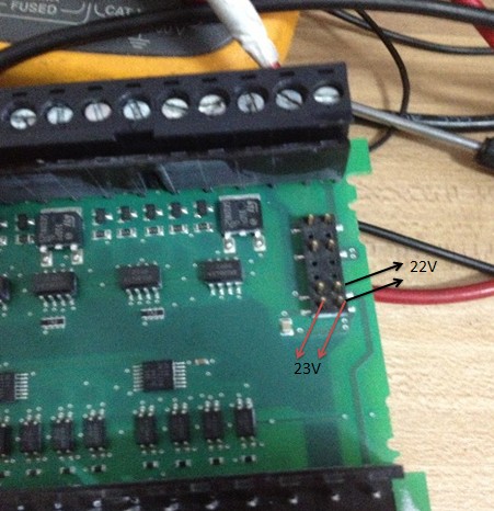 我測試了一下電源板,紅線之間的電壓是23V,黑線之間的電壓是22V,電源板是不是沒有問題呢?