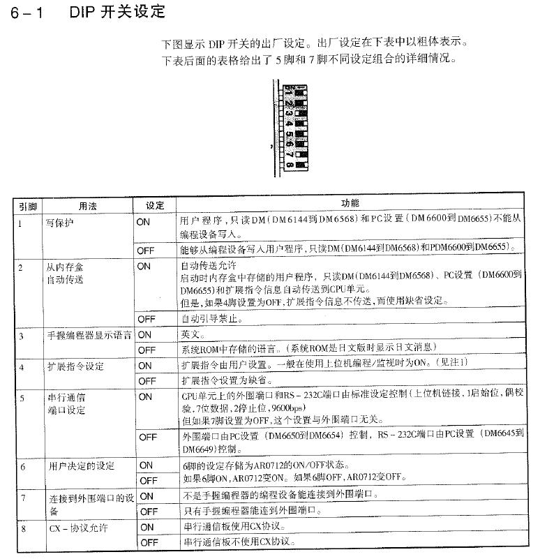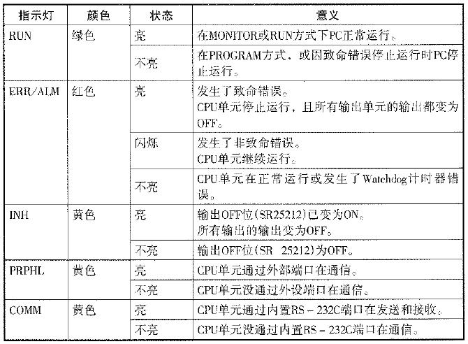 歐姆龍CQM1H CPU11  CPU單元前面的8個DIP開關有什么作用,還有 CPU單元有幾個指示燈分別RUN  ERR/ALM    INH  PRPHL  COMM  什么意思,正常是那個燈亮,通電后ERR/ALM(紅色)閃爍幾次后全滅了,是不是PLC壞了,請教了